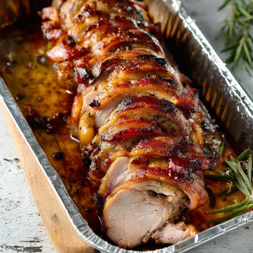 This Bacon Brown Sugar Pork Tenderloin is a savory-sweet dinner favorite. Tender pork is coated in a flavorful brown sugar spice rub, wrapped in smoky bacon, then seared and roasted until juicy and perfectly cooked. The result is a rich, caramelized crust with a tender center that pairs beautifully with roasted vegetables or mashed potatoes.