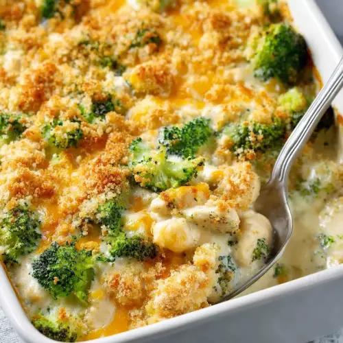 A classic comfort food casserole made with tender chicken, fresh broccoli, and a creamy cheese sauce, topped with golden bread crumbs. It’s a family favorite perfect for weeknight dinners or make-ahead meals.