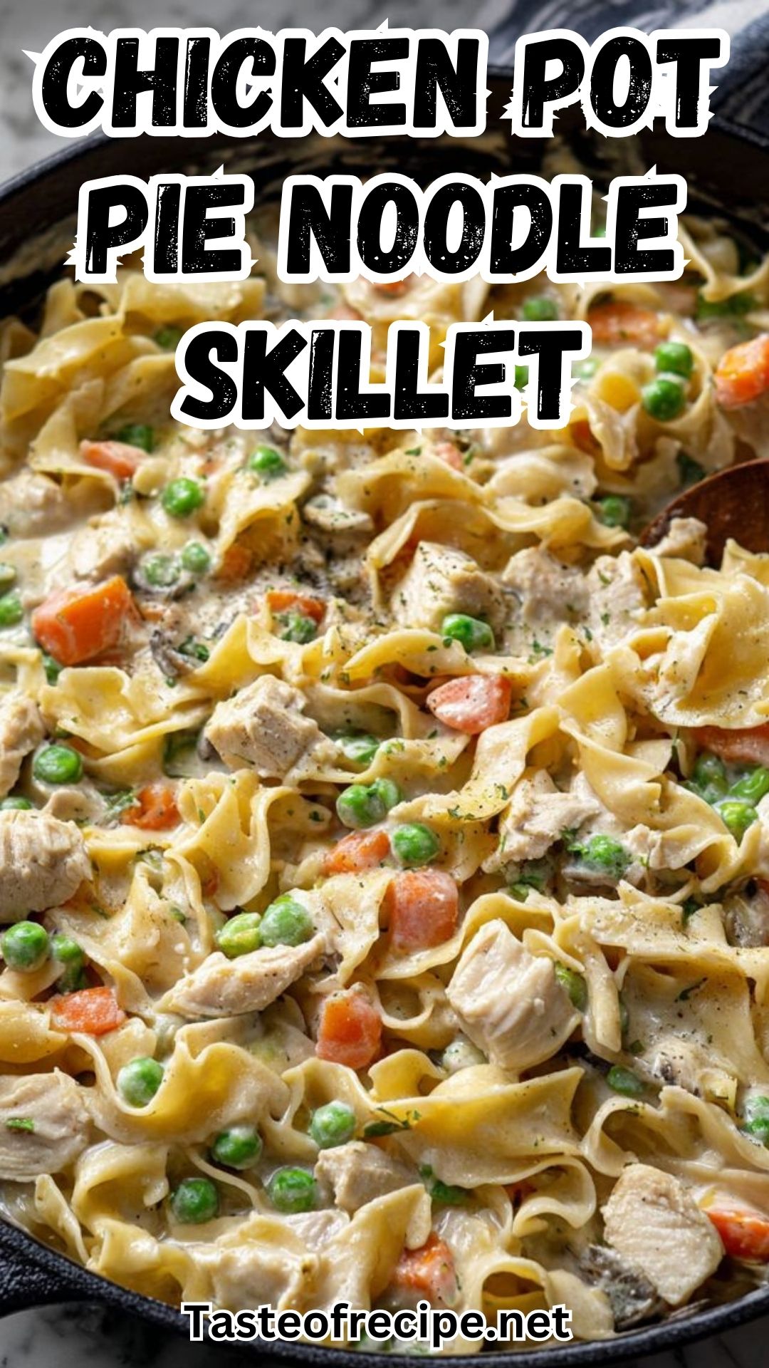 I had some leftover rotisserie chicken (bless those little grocery store lifesavers), a half-bag of frozen peas and carrots, a sweet onion rolling around in the drawer, and a pack of egg noodles I honestly forgot I had. And somewhere in the chaos of that weekday evening, this skillet dinner was born. Creamy, savory, comforting—and no crust to fuss with. Just simple, hearty, one-pan goodness that fills your belly and warms your soul.