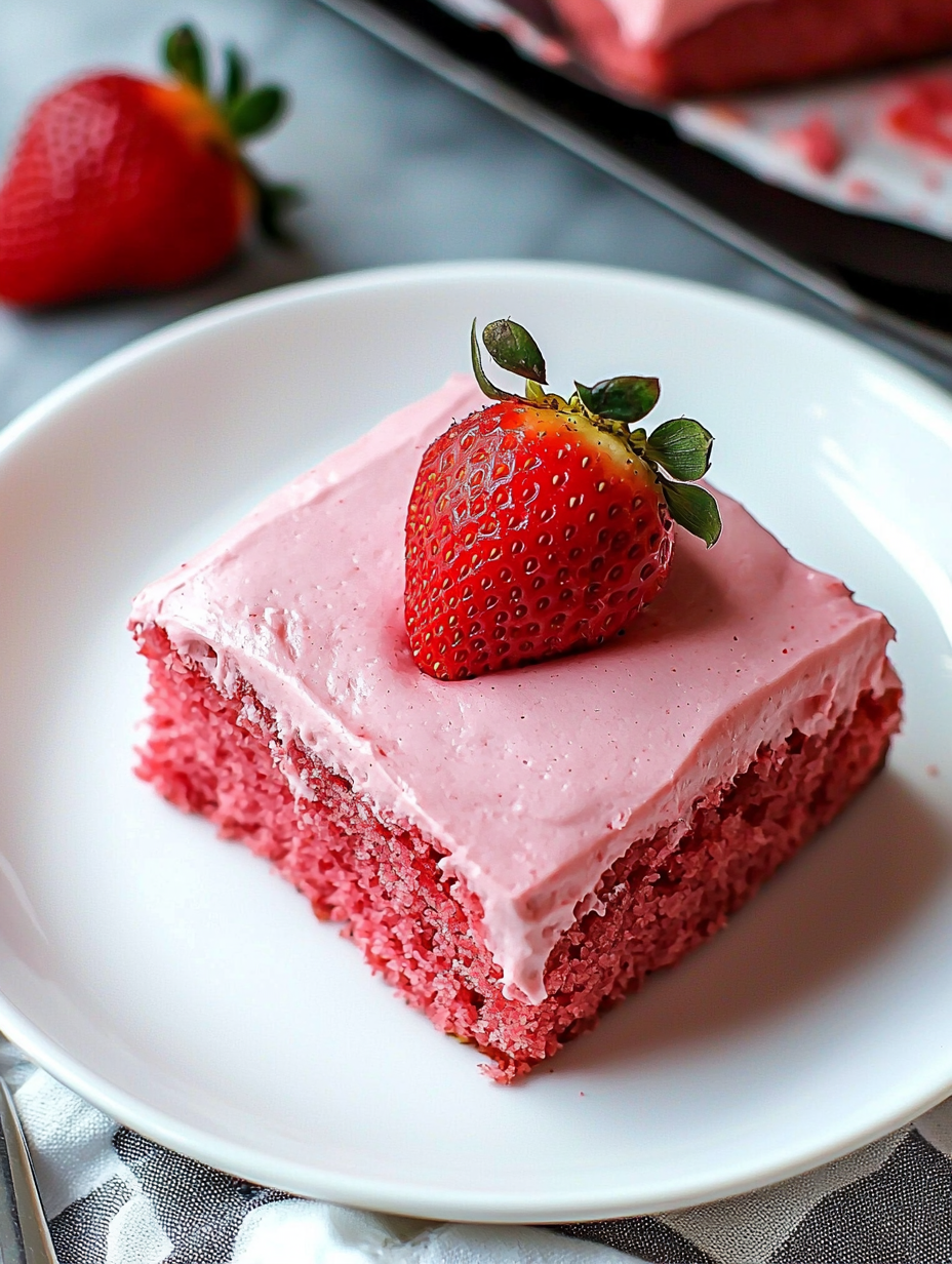 - Frost the cooled cake layers and decorate with fresh strawberries if desired.