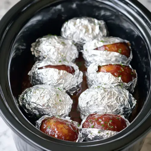 When they’re done, turn off the slow cooker and leave the lid ajar for ten minutes before you open any packets. The juice inside is extremely hot — I’m not being dramatic — and if you tear into the foil immediately it will steam your hand and spill everywhere. Open them away from your face. Peel the foil back slowly. This is the moment that got my daughter to start calling them treasure apples, and I think about that every single time.