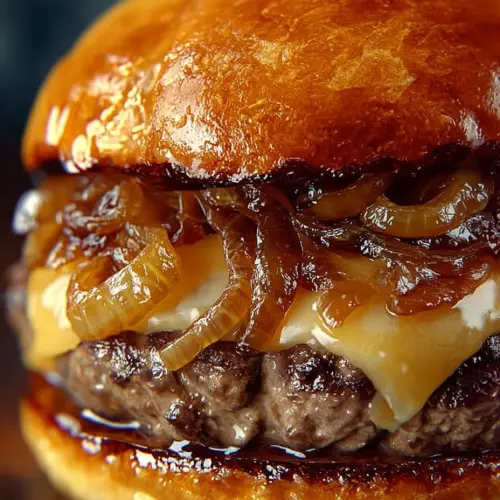 - Place each patty on a toasted bun, top generously with caramelized onions, then add the top bun.