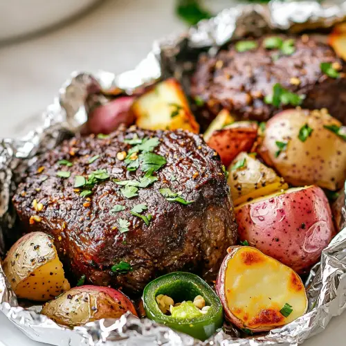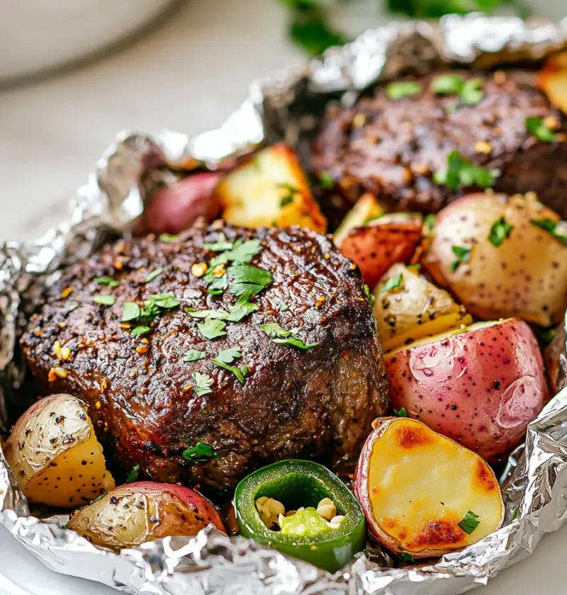 - Fold the foil into sealed packs. Bake in a preheated 375°F oven for 25-30 minutes, or grill at 400°F for 15-20 minutes, until steak is cooked and potatoes are tender.