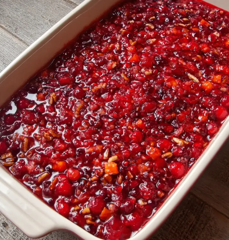 Here’s where the patience comes in: it needs to chill overnight. Not for two hours, not until it looks sort of set. Overnight. This is why you make it the day before. The flavors need time to get acquainted with each other. The pecans soften just slightly. The orange peel mellows. In the morning, when you pull it out and it’s this gorgeous deep ruby-red slab in the pan, you’ll understand.