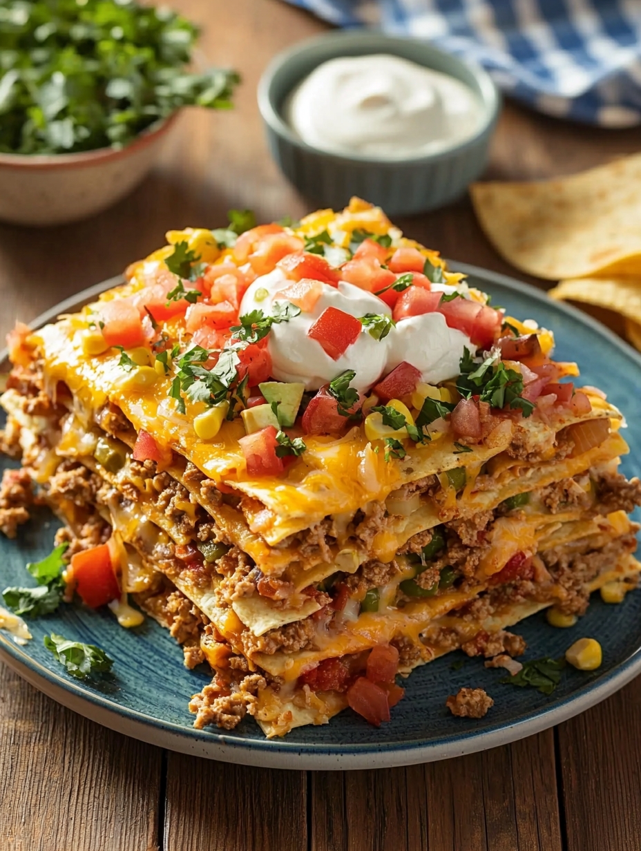 Spread a layer of the taco filling over the tortillas, followed by a generous sprinkle of shredded cheese. Repeat the layers—tortilla, taco filling, cheese—until all ingredients are used, ending with a layer of cheese on top.