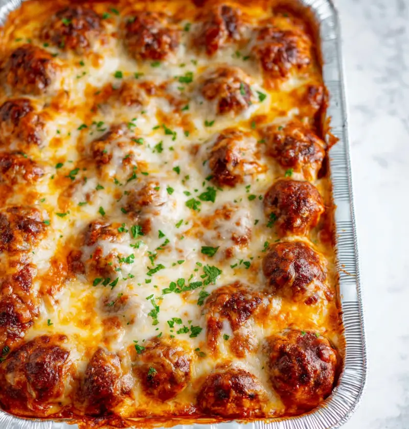 - In a separate bowl, mix meatballs with marinara sauce. Spoon over the cheese layer.