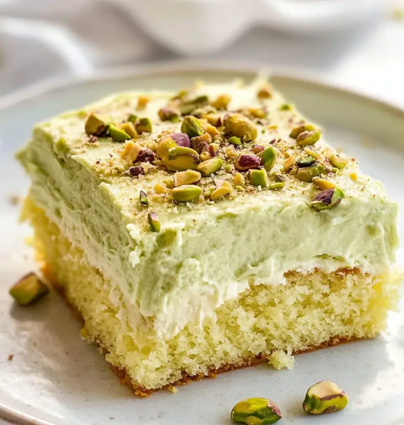 - Spread the pistachio frosting evenly over the cooled cake. Refrigerate for at least 2 hours to set.