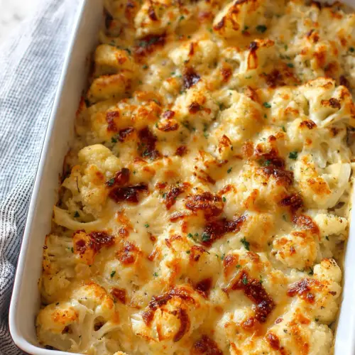 - Bake for 30–35 minutes, until cauliflower is tender and top is golden.