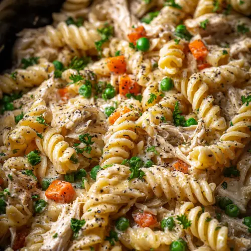 So here’s what I do instead: Slow Cooker Chicken Pot Pie Pasta. All the cozy goodness, none of the fuss. You toss it together, go about your day — check the garden, feed the chickens, fold the laundry you swore you’d put away two days ago — and come suppertime? The whole house smells like a warm hug.