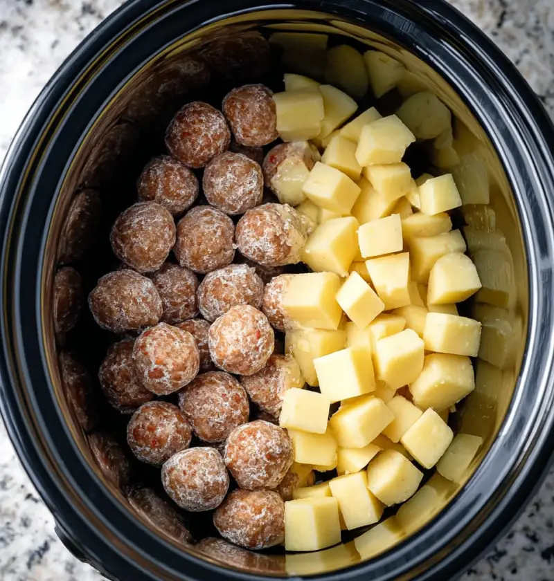 Put the potatoes in the bottom — all of them, spread them out somewhat evenly. They need to be on the bottom because they take the longest, and if you bury them under the meatballs they won’t cook through properly. I learned this the hard way once and had crunchy potatoes at the center and a table full of people waiting for dinner, which is a specific kind of humiliation.
