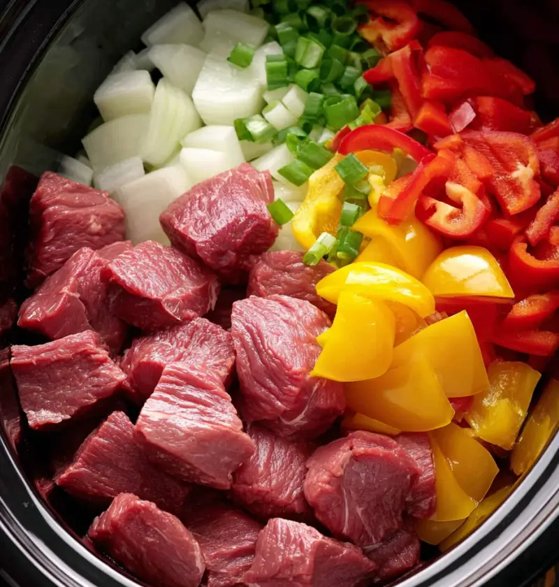 Layer your beef strips, sliced onions, and bell peppers into your slow cooker. No need to sear — trust the process.