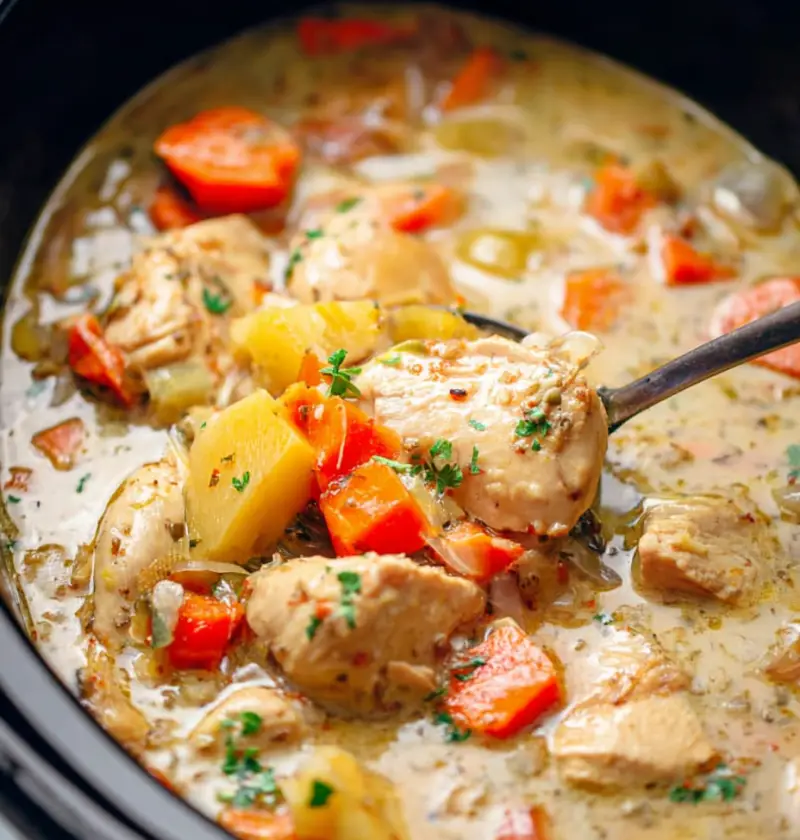 - Cover and cook on low for 7–8 hours or on high for 4–5 hours, until vegetables are tender and chicken is cooked through.