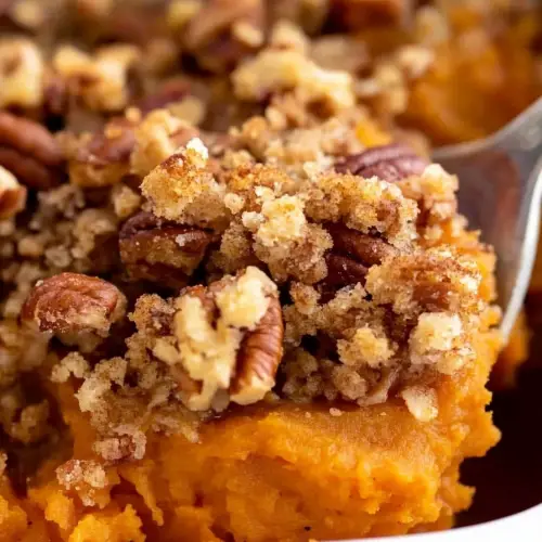 - Evenly sprinkle the pecan topping over the sweet potato mixture.