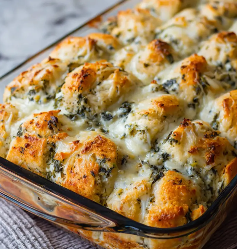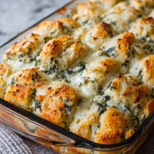 I don’t know who first came up with the idea to bake biscuits with spinach dip, but I want to thank them personally. This pull-apart bread has made its way into our regular rotation — not because it’s “impressive,” but because people love it. There’s something about the buttery biscuit pieces all tangled up with creamy dip and cheese that just… hits right.