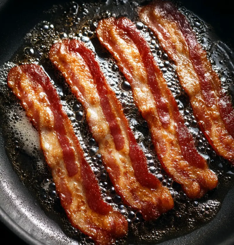 Medium or medium-low heat allows fat to render steadily while moisture escapes without drama. It takes a bit longer, but the bacon cooks evenly and behaves itself.