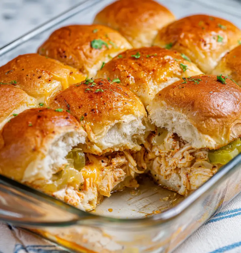 - Preheat oven to 350°F. Line a 9x13 tray with bottom halves of slider buns. Layer with cheddar cheese, chicken mixture, jalapeño slices, and fried onions.