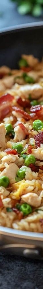 A quick and savory twist on fried rice, loaded with tender chicken, crispy bacon, scrambled eggs, and fresh green onions. Perfect for a quick meal with big flavor!