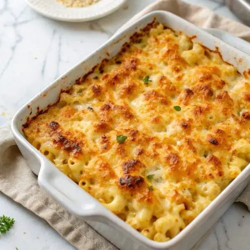 A rich, ultra-creamy baked mac and cheese featuring a smooth cheddar-Gruyère sauce with just the right balance of sharpness and nuttiness. Baked until gently bubbling, it delivers that perfect silky texture without drying out.