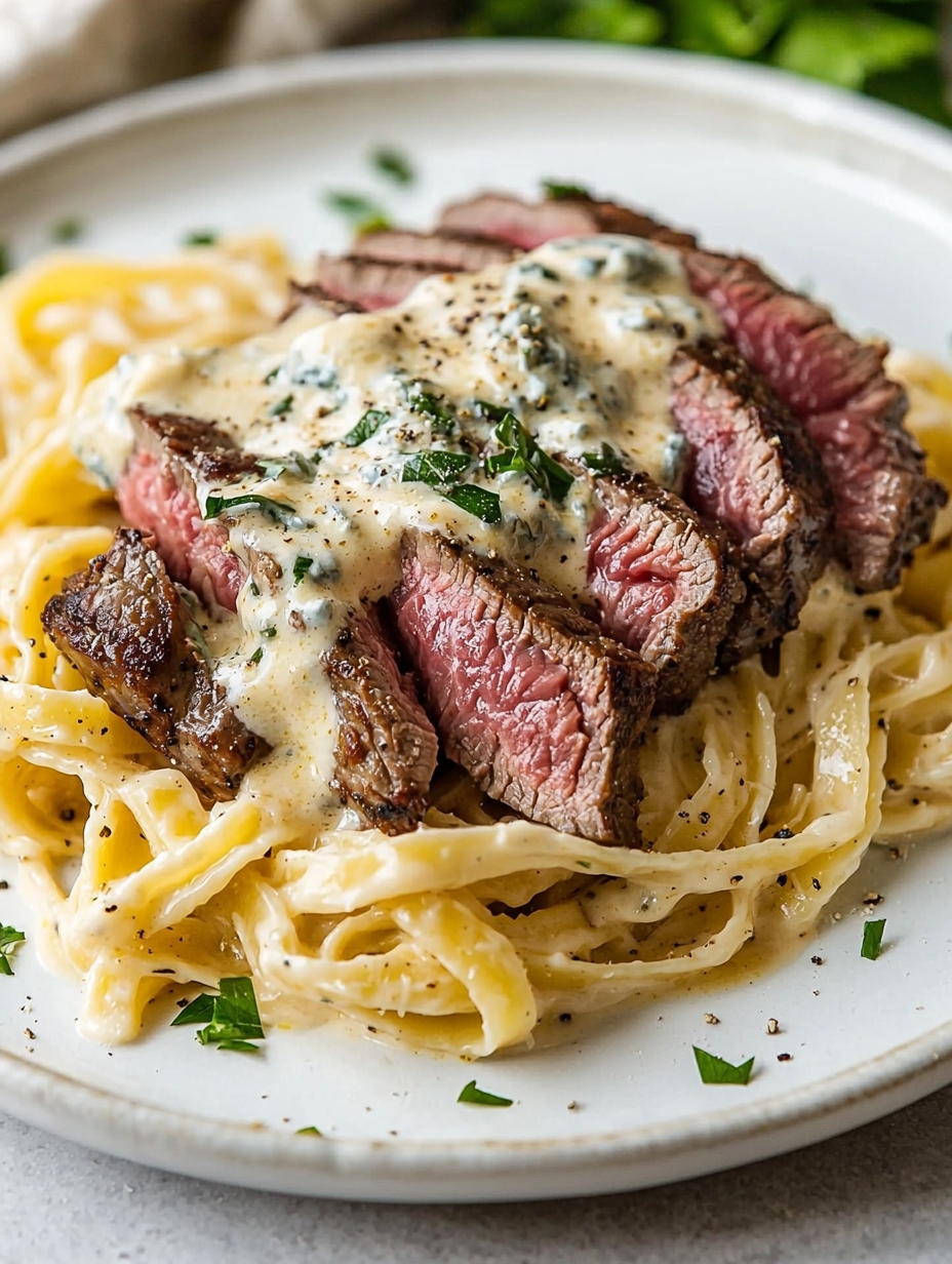 A rich and indulgent pasta dish featuring tender seared steak slices, creamy Parmesan Alfredo sauce, and tangy Gorgonzola crumbles. This restaurant-style entrée is perfect for special dinners, offering bold flavors and a satisfying texture combination of juicy beef and silky pasta.