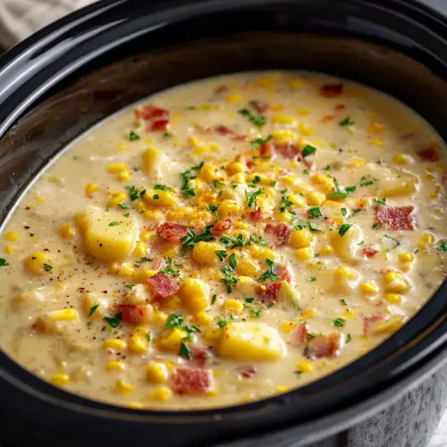 This cozy, comforting chowder is the perfect set-it-and-forget-it meal. Packed with sweet corn, tender potatoes, smoky bacon, and a rich, creamy base, it’s a slow cooker classic that feels like a hug in a bowl. Perfect for busy days, cold nights, or when you just want something warm and nourishing.