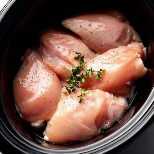 Place the chicken breasts into the slow cooker. No cutting, no browning. Just plop them in.