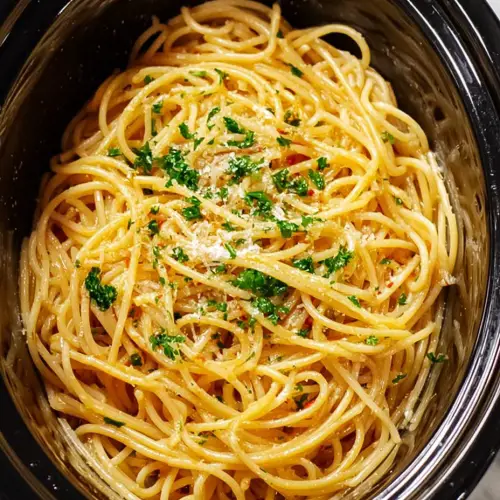 A modern twist on a classic Italian dish, this slow cooker Spaghetti Aglio e Olio is effortlessly simple and packed with garlicky flavor. Minimal ingredients and hands-free cooking make it ideal for busy days or laid-back dinners. Bonus: it's pantry-friendly!