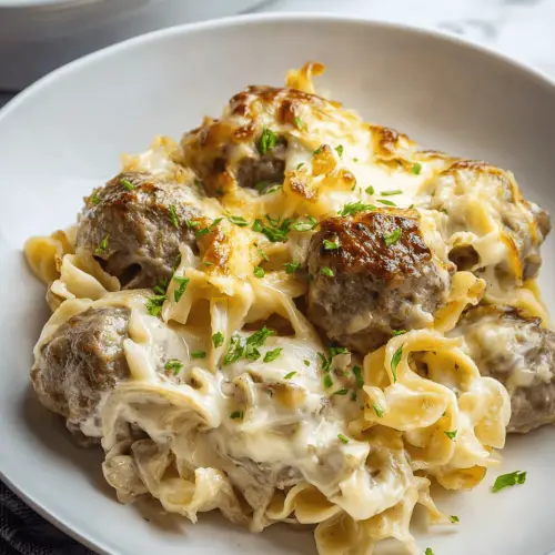 Add cooked noodles to baking dish. Nestle meatballs in the noodles. Pour sauce over and top with grated Swiss cheese.
